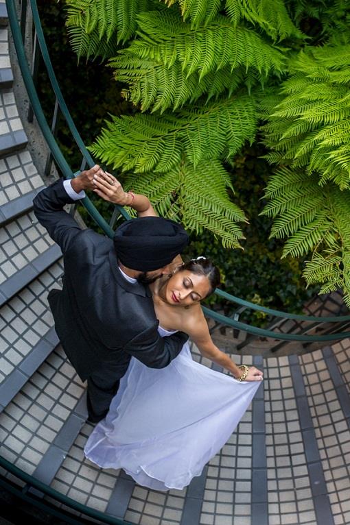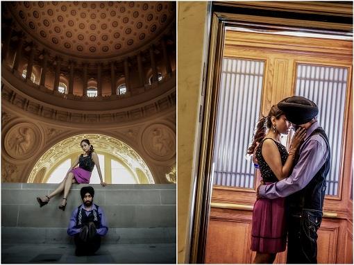We are almost wrapping up our special engagement week here at IndianWeddingSite.com, and next up we have an engagement submission from the wildly creative Joseph Pascua Photography! Today's couple, Divya and Harp, had an eventful day of picture taking stopping at unique places within San Francisco starting in Potrero Hill, then moving down to the Mission District, followed by San Francisco City Hall, and finally the Embarcadero center. Their day of venue hopping really seems to have paid off as their pictures are absolutely gorgeous! I particularly love how Divya and Harp changed their outfits at every stop to complement their surroundings. The outfits really added a lot of composition to each picture and the results were outstanding!