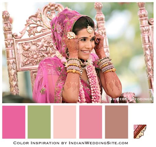 A romantic and modern palette of pink: Rani pink, leaf green, pink macaron, Rajasthan pink and plaster pink.