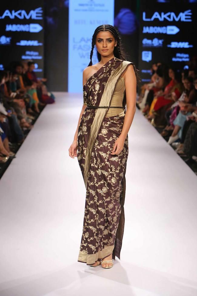 Debuting her collection, Varanasi Weaves, Kumar delivered traditional attire infused with modern day prints and colors. Her most notable staple on the runway was her incorporation of the skinny belt tied tightly around the waist ensuring a skinny bodice with a sari flare.